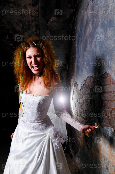 Молодая женщина в свадебном платье в заброшенном здании