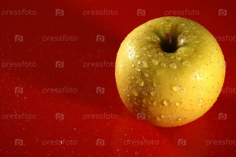 Желтое яблоко крупным планом на красном фоне