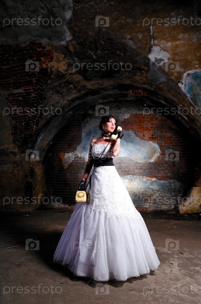 Молодая женщина в свадебном платье в заброшенном здании