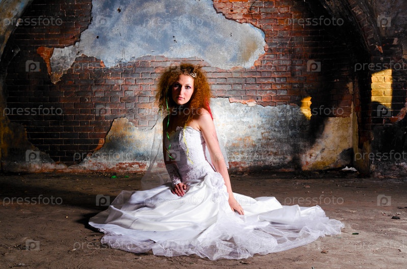 Молодая женщина в свадебном платье в заброшенном здании