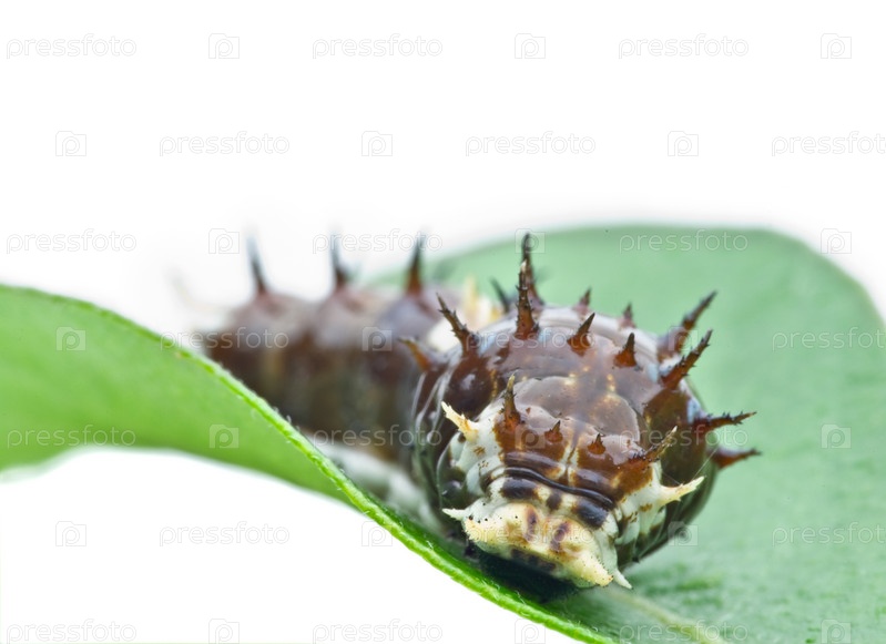 Большая гусеница с шипами ползет по зеленому листу