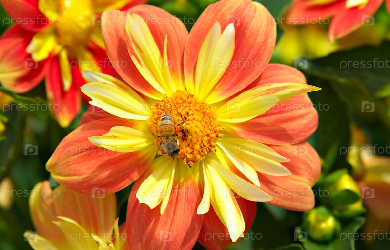 Пчела собирает пыльцу с красно-желтого мексиканского подсолнечника
