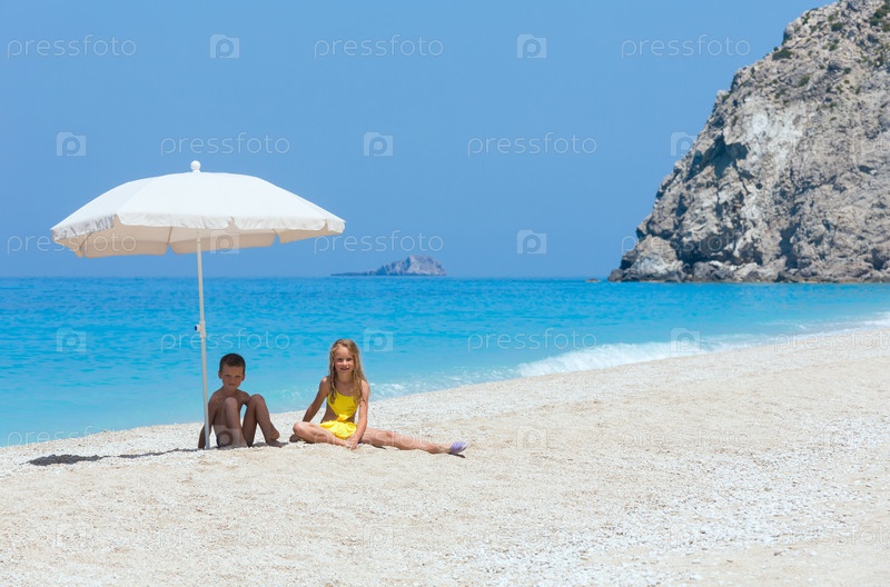 Двое детей на белом пляже лазурного Ионического моря. Эгремни, Лефкас, Греция