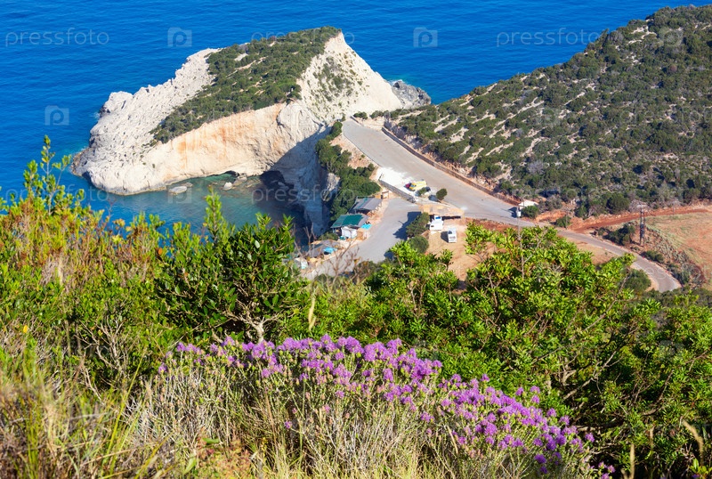 Цветы и летний пляж Порто-Кацики на Ионическом море. Лефкас, Греция. Вид сверху