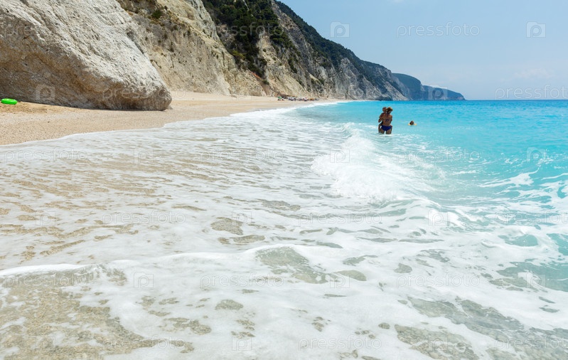 Семья отдыхает на белом пляже, Ионическое море, Эгреми, Лефкас, Греция)