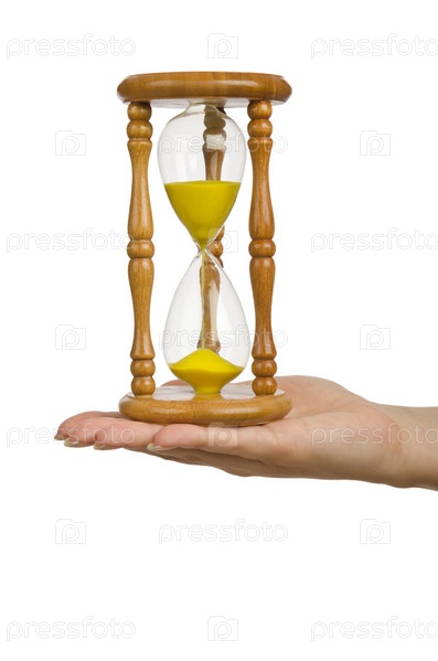 Руку держит песочные часы на белом фоне