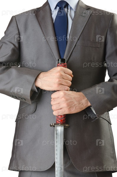 Бизнесмен с мечом на белом фоне