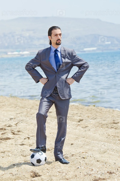 Бизнесмен с мячом на пляже