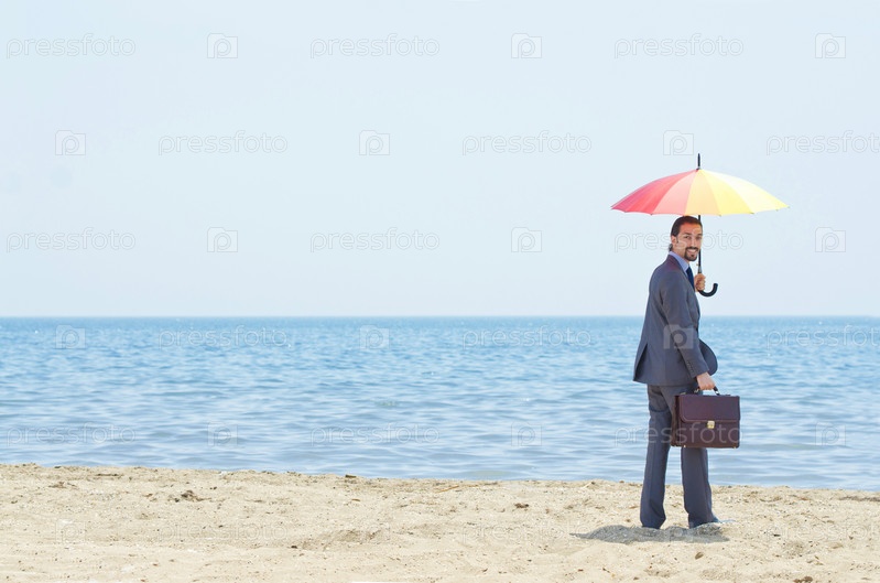Бизнесмен с зонтиком на пляже