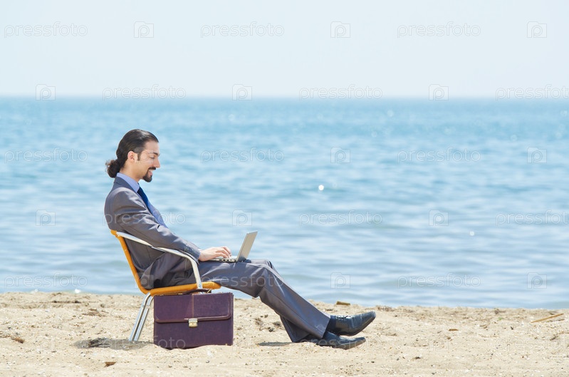 Бизнесмен работает на ноутбуке на берегу моря