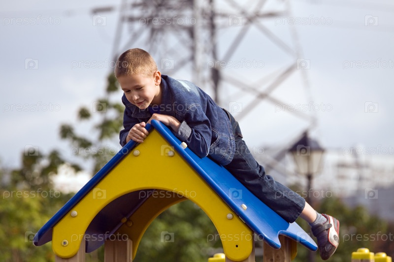 Мальчик на детской площадке в городском парке