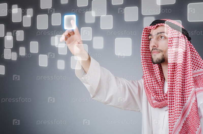 Молодой араб нажимает на виртуальные кнопки