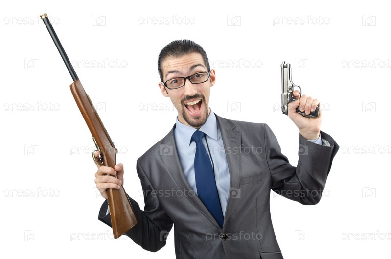 Бизнесмен с оружием на белом фоне