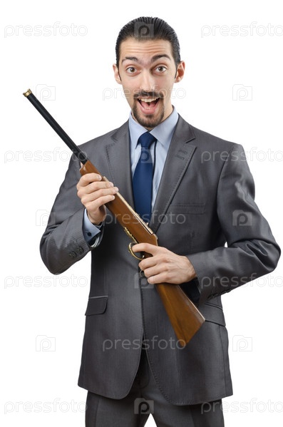 Бизнесмен с оружием на белом фоне