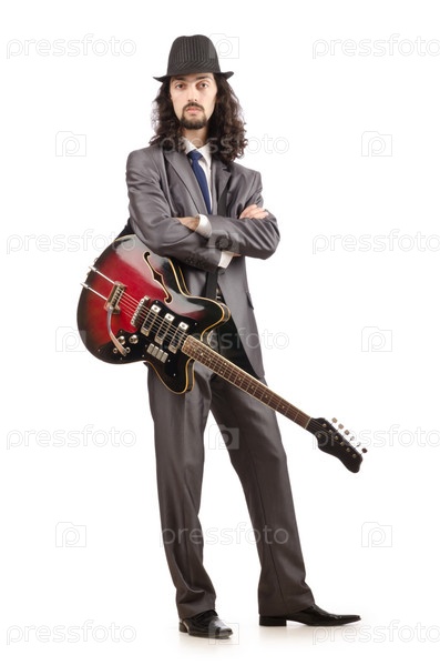 Гитарист в деловом костюме на белом фоне