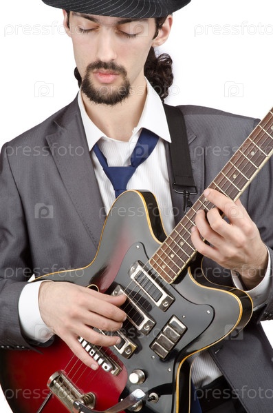 Гитарист в деловом костюме на белом фоне