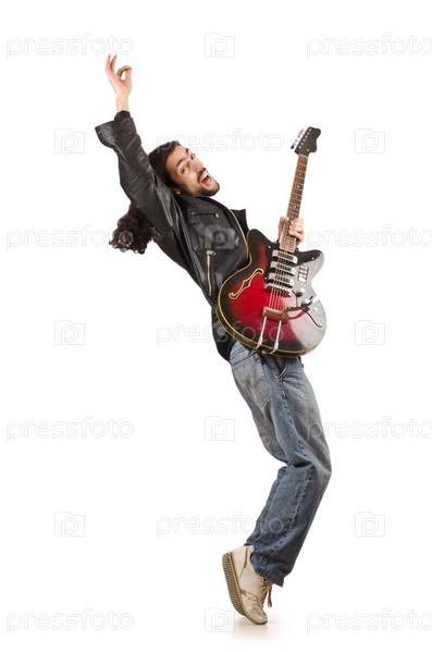 Молодой человек играет на гитаре на белом фоне