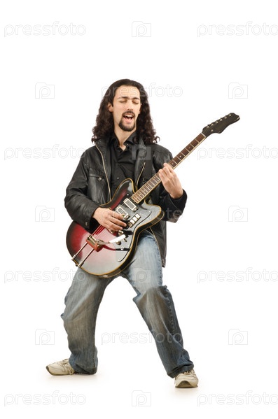 Молодой человек играет на гитаре на белом фоне