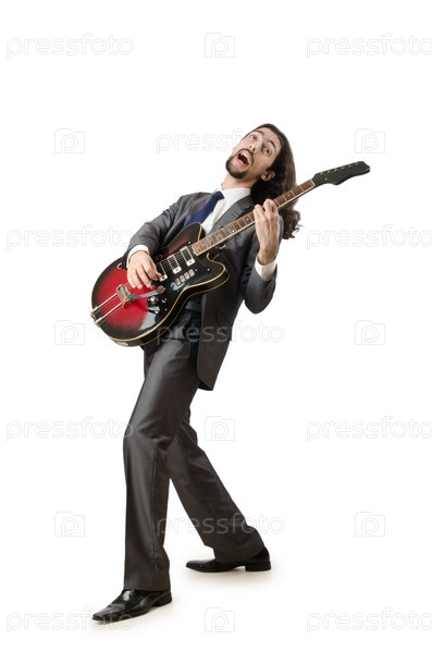 Гитарист в деловом костюме на белом фоне