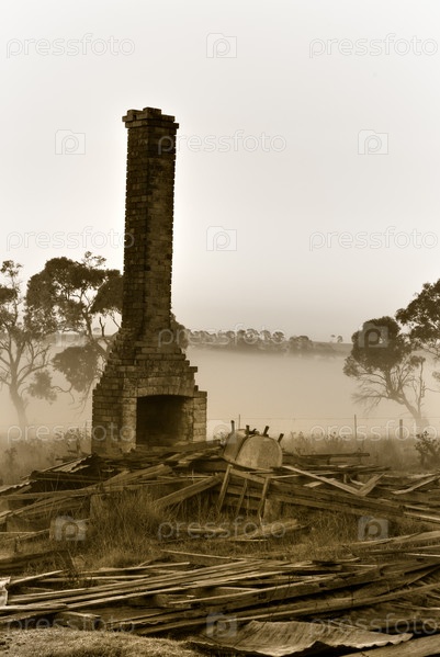 Дымоход стоит непоколебимо среди обломков в мрачные времена