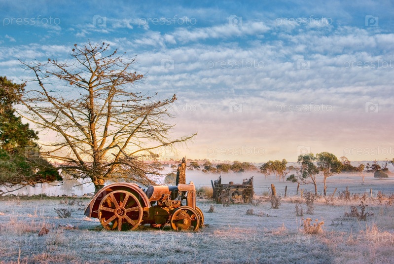 Старый трактор лежит на поле морозным утром