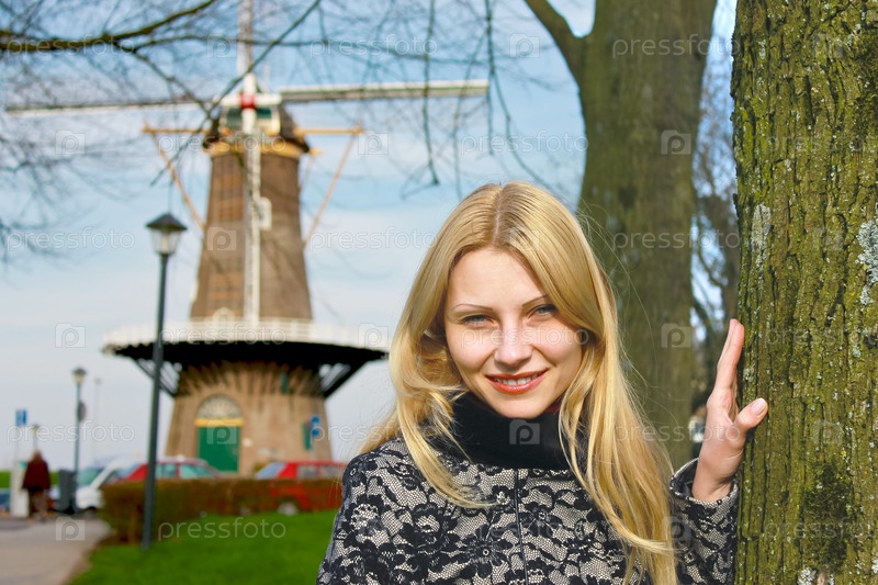 Девушка возле ветряной мельницы в голландском городе Горинхем. Нидерланды