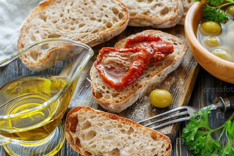 Свежая чиабатта, оливки, масло и высушенные на солнце томаты