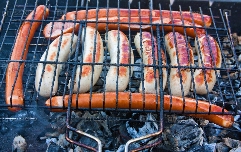 Красные и белые сосиски на гриле
