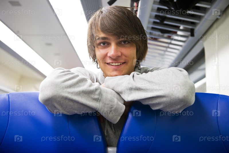 Красивый молодой человек смотрит назад из-за кресел в вагоне поезда
