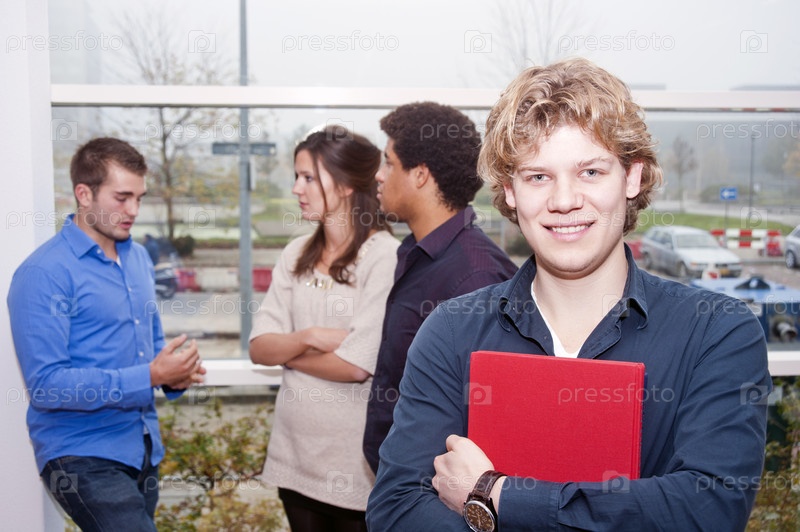 Улыбающийся молодой человек прогуливается на перемене между лекциями в кампусе колледжа с другими студентами, беседующими на заднем плане