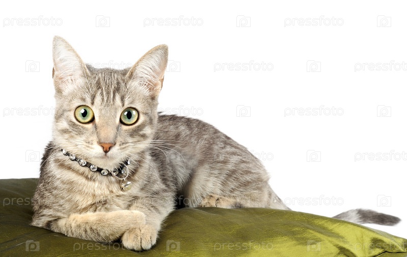 Красивый серый котенок на зеленой подушке