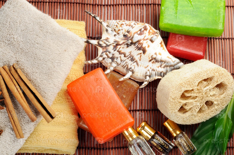 Спа-принадлежности: полотенца, мыло и духи крупным планом