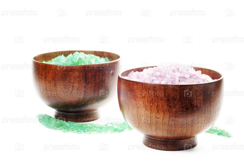 Ароматические природные минеральные соли в деревянных чашах на белом фоне