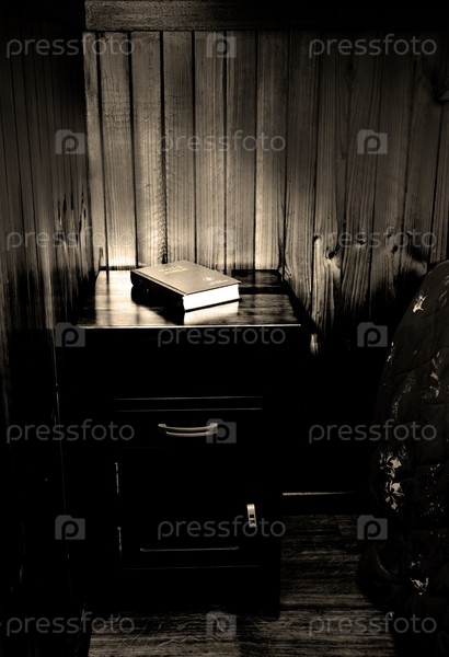 Библия на тумбочке у кровати в номере дешевой гостиницы