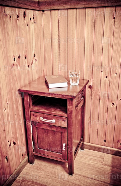 Библия на тумбочке у кровати в номере дешевой гостиницы