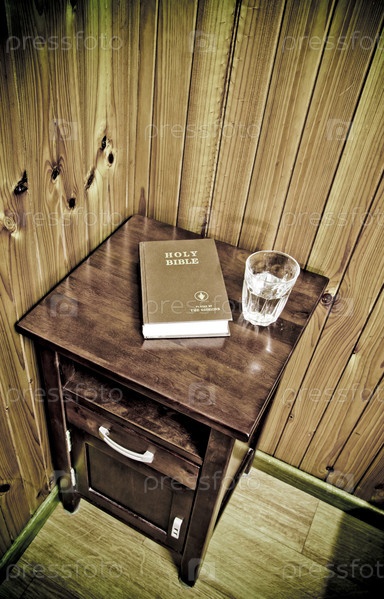 Библия на тумбочке у кровати в номере дешевой гостиницы