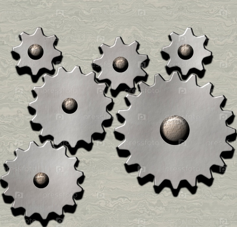 Металлические шестеренки заводного механизма на металлическом фоне