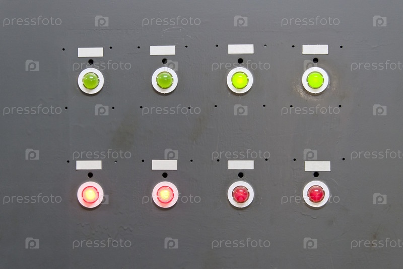 Серый электрощит с красными и зелеными лампами