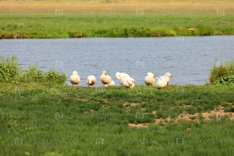 Белые гуси на зеленом поле рядом с прудом