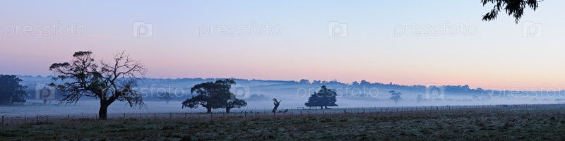 Панорама с силуэтами больших деревьев в тумане на восход солнца зимой в сельской местности с безоблачным небом. Полуостров Морнингтон, Виктория, Австралия