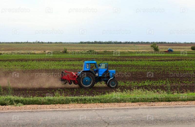 Синий трактор на поле возделывает почву