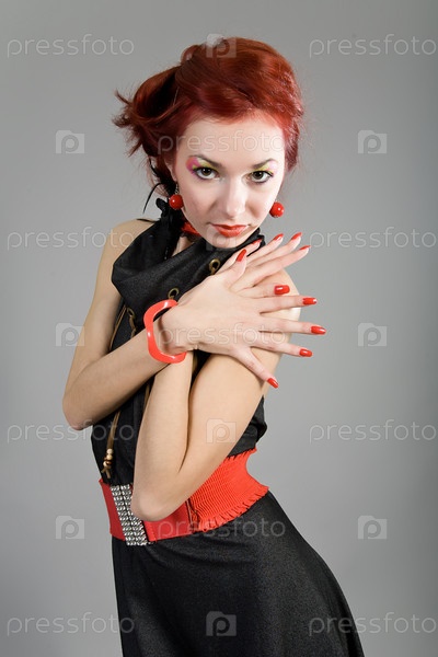 Красивая рыжеволосая девушка на сером фоне
