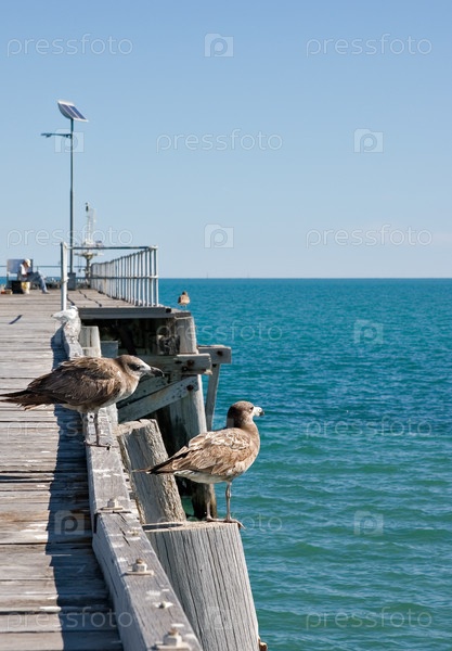 Две морские птицы буревестник стоят на краю пирса и смотрят на воду
