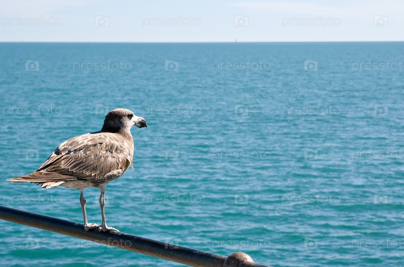 Птица стоит на перилах и смотрит на далекий морской горизонт