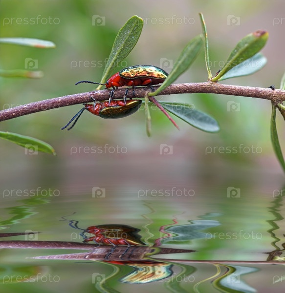 Кто вперед! два жука бегут по ветке над водой