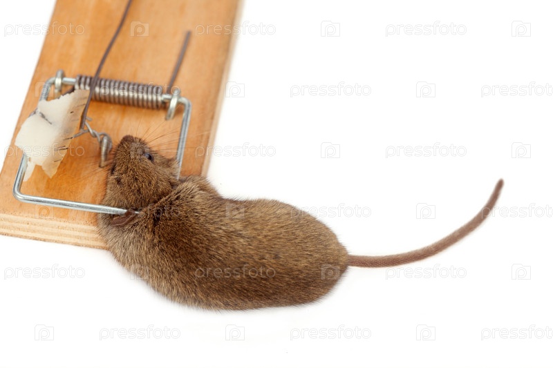 Мышка в мышеловке на белом фоне