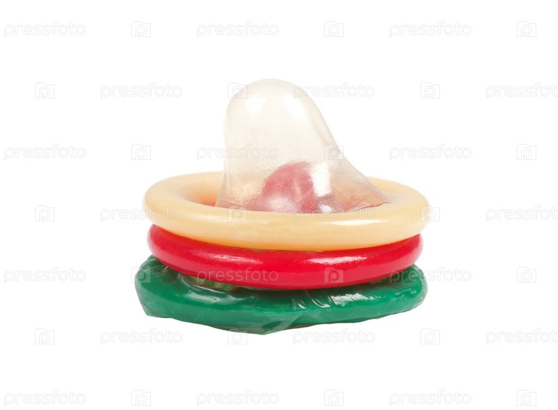 Три ярких презерватива, изолированных на белом фоне