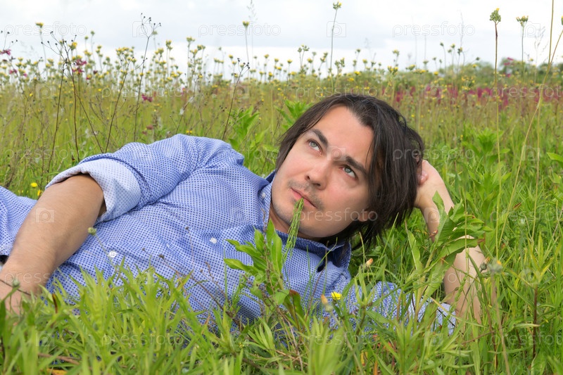 Мужчина лежит на траве с соломинкой во рту