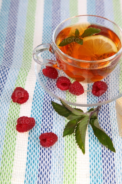 Чай с малиной и мятой на полосатой скатерти