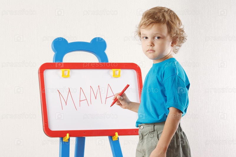 Маленький милый мальчик пишет слово "мама" на доске
